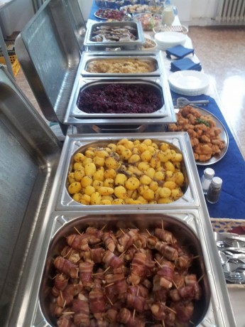 Bramborová polévka, chléb. Kuřecí vývar s nudličkami, chléb. Studený bufet: kaviárové vajce, lososové vajce, syrová roláda, šunková doboška, obložená misa syrová, obložená misa údeninová.